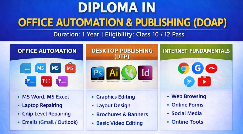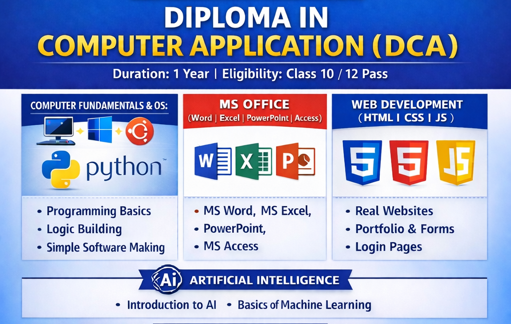 We offer professional courses like DCA, Tally with GST, Advanced Excel, Web Development, Software Development and AutoCAD. Our practical training system ensures real-world skills.